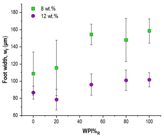 Measure of droplet foot width (wf) as a function of WPI%R for cp = 8 wt%, and 12 wt%.