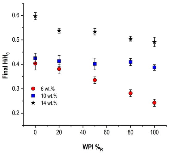 Evaluation of the impact of WPI%R on WPI/NPC droplet final normalized height (Hf/Hmax) for dispersions with cp = 6 wt%, 10 wt%, and 14 wt%.