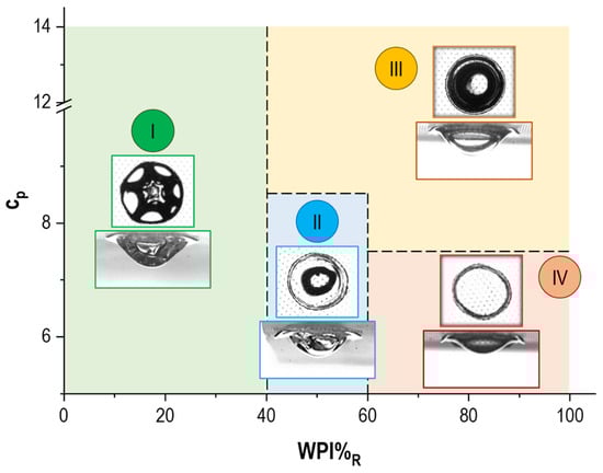 The full characterization of the droplet base diameter (D) and apex height (H), coupled with the observation of the vacuole formation at the late stage of the evaporation process [9,29,30], led to the construction of a preliminary phase diagram for mixes of whey proteins and casein micelles. The goal of the latter is mainly to predict the characteristic shape of dry WPI/NPC particles, knowing the initial protein concentration (cp) of the dispersions and their composition (WPI%R). In this regard, Figure 6 displays four main regions corresponding to specific morphologies: