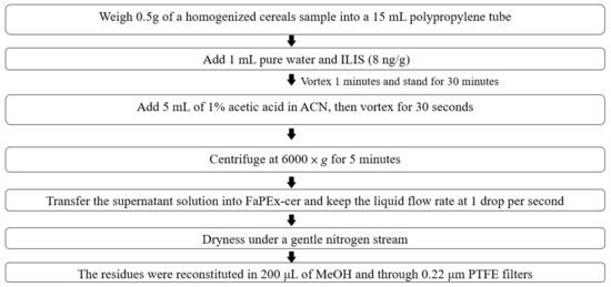 Method B: The FaPEx method is simple and involves using single-use prefilled sealed cartridges with MgSO4, PSA, C18, and graphitized carbon black. For FaPEx, a homogenized cereal sample (0.5 g) was loaded into a 15 mL PP tube. Subsequently, pure water (1 mL) was added, and the sample was spiked with an ILIS (8 ng/g) and vortexed for 1 min. After the sample was allowed to stand for 30 min, 5 mL of ACN with 1% acetic acid was added; the mixtures were vortexed for 30 s and centrifuged at 6000× g for 5 min. Thereafter, the supernatant solution was transferred to a FaPEx-cer kit, with the liquid flow rate controlled at 1 drop/s and the dryness level controlled using a gentle nitrogen stream. Finally, the residue was treated in the same manner as the QuEChERS procedure. Figure 1 presents a flowchart of sample preparation.