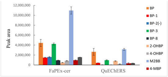 Diet is a major source of BP exposure in the general population. Humans exposure to BPs from FCM occurs as a result of migration from materials into foodstuffs and foods. Although BP levels in foodstuffs are too low to constitute a risk, long-term and cumulative exposure to BPs may have adverse effects. Thus, a convenient and reliable analytical method for quantifying BP contents in foods is required. Pollutant extraction is a critical point in chemical analyses [16]. Solvent extraction with acetonitrile [9,17] and pressurized liquid extraction (PLE) [18] have been proposed for determining the level of BPs in breakfast cereals; however, these techniques are time-consuming and require a large volume of organic solvents. Solvent extraction followed by solid-phase extraction (SPE) with a hydrophilic–lipophilic balance (HLB) or silica cartridge [19,20,21]; the quick, easy, cheap, effective, rugged, and safe (QuEChERS) method [22]; and QuEChERS combined with SPE have been proposed [23]. However, some methods are limited in terms of instrument sensitivity and number of BPs that can be simultaneously analyzed. Fast pesticide extraction (FaPEx) is a simplified version of the QuEChERS method and is based on the same principles. It involves using single-use prefilled sealed cartridges [24]. FaPEx is simple and fast and can be used to extract pesticide residues in agricultural samples. Chromatographic methods combined with MS represent a predominant determination practice. Gas chromatography (GC)–mass spectrometry (MS) has been frequently applied to the analysis of some FCM substances and BPs in foods [9,11,18,19]. BP content in cereal-based products is also quantified through high-performance liquid chromatography (HPLC) with UV detection [25], HPLC combined with diode array detection [17,26], HPLC combined with MS [9], and tandem MS (MS/MS) [17,22,23,27].