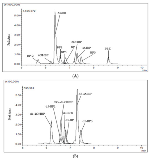 The representative chromatogram of a rice cereal sample spiked with 20 ng/g of the BP and BP analog standards (A) and 8 ng/g of the ILIS (B).