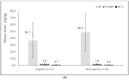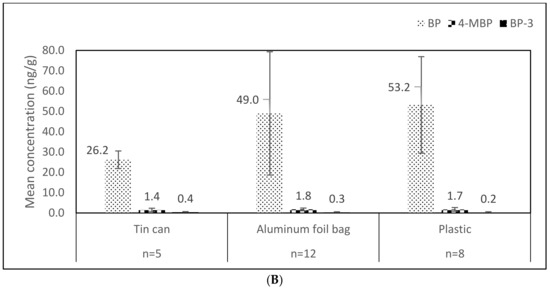 The experimental results are presented as means (SDs, range). The nonparametric Mann–Whitney U test and Kruskal–Wallis test were used to evaluate the differences in BP and BP analog levels between organic and nonorganic foods and among the packaging materials. Statistical analysis was performed using SPSS (version 19.0, SPSS Inc., Chicago, IL, USA), and the significance level was p < 0.05.