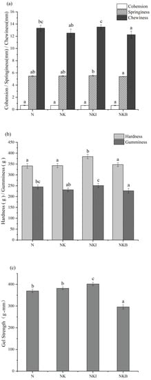 Gel properties of (a) cohesiveness, springiness, chewiness (b) hardness, gumminess and (c) gel strength of N (NaCl only), NK (30% NaCl was replaced with 30% KCl), NKI (30% NaCl was replaced with 25% KCl and 5% DIMP), NKB (30% NaCl was replaced with 25% KCl and 5% basil). DIMP stands for disodium inosine-5′-monophosphate. Different letters (a–c) indicate significant differences (p < 0.05) between the samples.