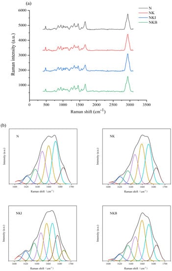 Raman spectrum (a) and deconvoluted amide I Raman band (b) of N (NaCl only), NK (30% NaCl was replaced with 30% KCl), NKI (30% NaCl was replaced with 25% KCl and 5% DIMP), NKB (30% NaCl was replaced with 25% KCl and 5% basil). DIMP: disodium inosine-5′-monophosphate.