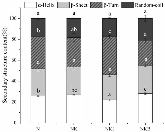 Secondary structure content of N (NaCl only), NK (30% NaCl was replaced with 30% KCl), NKI (30% NaCl was replaced with 25% KCl and 5% DIMP), NKB (30% NaCl was replaced with 25% KCl and 5% basil). DIMP stands fordisodium inosine-5′-monophosphate. Different letters (a–c) indicate significant differences (p < 0.05) between the samples.