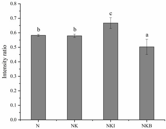 An important feature of tryptophan residues was the doublet Raman bands at 1360 cm−1 and 1340 cm−1, the intensity ratio of the doublet (I1360/I1340) reflecting the transition of tryptophan microenvironment. A higher ratio indicates an increased buriedness of tryptophan, while a lower ratio exhibits that they are exposed to a hydrophilic environment [43]. Compared with the N group, the doublet ratio of NKI group exhibited a significant rise from 0.58 to 0.66 (p < 0.05), which suggested that the buriedness degree of tryptophan increased when DIMP was added into the UFMG (Figure 4). The results illustrated that DIMP better promoted protein aggregation, more likely via hydrophobic interaction, and contributed to the formation of a more ordered gel structure than other groups. On the contrary, the ratio significantly decreased to 0.50 after adding basil to the UFMG (p < 0.05), which meant that more tryptophan residues were exposed. This might because of the partial loss of water, which induced a destruction of the hydrophobic cluster structure and weakened the gel network to a certain extent [44]. Therefore, the transform in the tryptophan microenvironment and protein secondary structure led to changes in gel properties [45].