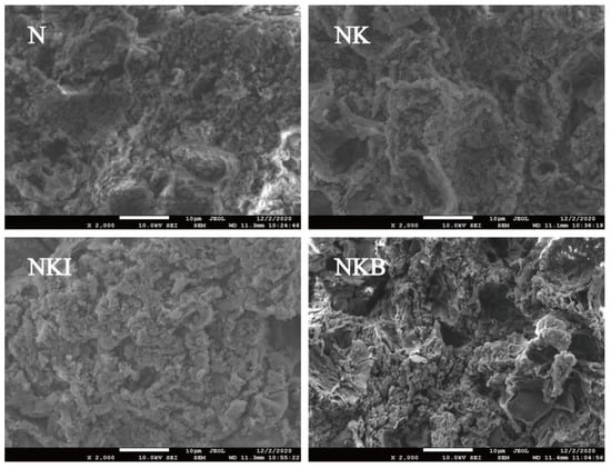 Gel microstructure (×2000) of N (NaCl only), NK (30% NaCl was replaced with 30% KCl), NKI (30% NaCl was replaced with 25% KCl and 5% DIMP), NKB (30% NaCl was replaced with 25% KCl and 5% basil). DIMP stands fordisodium inosine-5′-monophosphate. Different letters (a–c) indicate significant differences (p < 0.05) between the samples.