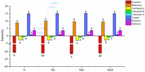 Bar plot for electronic tongue data of N (NaCl only), NK (30% NaCl was replaced with 30% KCl), NKI (30% NaCl was replaced with 25% KCl and 5% DIMP), NKB (30% NaCl was replaced with 25% KCl and 5% basil). DIMP stands for disodium inosine-5′-monophosphate. Different letters (a–c) indicate significant differences (p < 0.05) between the samples.