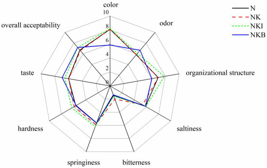 On the whole, most sensory evaluation scores of N and NK were similar, except for a slight reduction in bitterness and saltiness scores. However, when compared with the N group, the NKI group had better tissue structure, hardness, elasticity and chewiness scores, as well as superior taste and overall acceptability scores, in addition to the salty sense that was not inferior to the N group.
