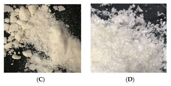 The appearance of LBA products is shown in Figure 3. All LBA samples took the form of crystals except for sample B, which had a syrup-like consistency. This sample was obtained by evaporation followed by crystallization in a drying oven; the resulting material was dense and the effective surface area available to vaporize water in the drying oven was small compared to sample A, which did not undergo the evaporation step and was therefore crystallized from an initial liquid state. Wilkinson et al. [27] have also established that products in a gel state took longer to dry than those in liquid state.