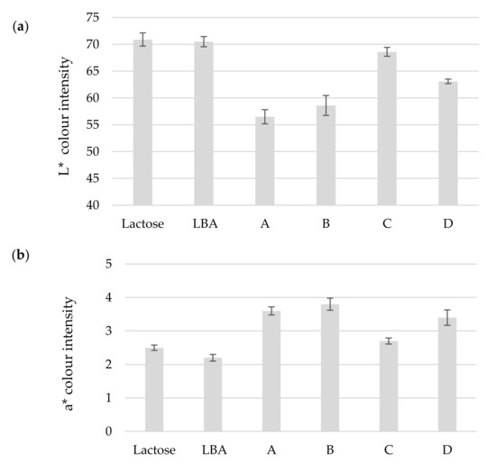 - Color analysis was conducted by dissolving 1 g of analyzed product in 10 mL of deionized water (10% solution). Color analysis was performed using L*a*b* coordinates defined by the International Commission on Illumination with a “Lovibond® LC100” (Tintometer® group, Lovibond house, Amesbury, UK) color analyzer. A negative a* value indicates the intensity of the green color, a positive value of a* indicates the intensity of the red color, a negative value of b* indicates the intensity of the blue color, a positive value of b* indicates the intensity of the yellow color, and L* is an indicator of white and black or light and dark intensity. The total color intensity difference was calculated by comparing the color of the obtained product with the color of commercial LBA. The given formula calculates the difference between the two colors to identify inconsistencies [18].where: