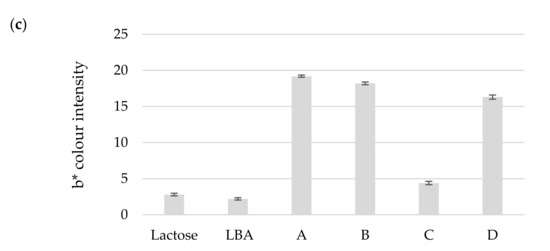 Results of color analysis of “Pa Panreac” lactose, “Sigma-Aldrich” lactobionic acid (LBA) and lactobionic acid samples. (a) L* coordination of white-black color; (b) a* coordination of red-green color; (c) b* coordination of yellow-blue color.