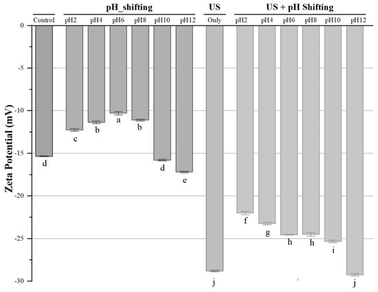 Zeta potential is widely used to characterize and measure the surface charges of protein molecules and the strength of repulsion or attraction between particles based on electrophoretic mobility technique []. As large repulsive forces between particles result in high absolute zeta potential values, a more stable system can be achieved with small, dispersed particles []. As it can be seen in Figure 1, the absolute value of zeta potential increased with an increasing pH level both in pH shifting alone and pH shifting with ultrasonication treatments, except at acidic pH levels during pH shifting alone treatments. The absolute zeta potential value of ultrasonication treated HPC dispersion samples raised significantly (p < 0.05) from [15.4 ± 1.28] mV to [29.4 ± 1.41] mV compared to the control. This might be explained with the cavitation effect of ultrasonication on the protein structure, which causes breakdowns and allows more charges on the molecules []. Similarly, Shen et al. [] observed that the application of ultrasonication significantly increased (p < 0.05) the absolute zeta potential of whey proteins from 14.9 mV to 27.94 mV at 20 kHz frequency for 20 min (10 s:5 s off/on cycles). On the other hand, the decreasing trend in absolute zeta potential values at the acidic pH levels during pH shifting alone treatments might be because of the change in ionization degree of the surface groups in HPC dispersions [].