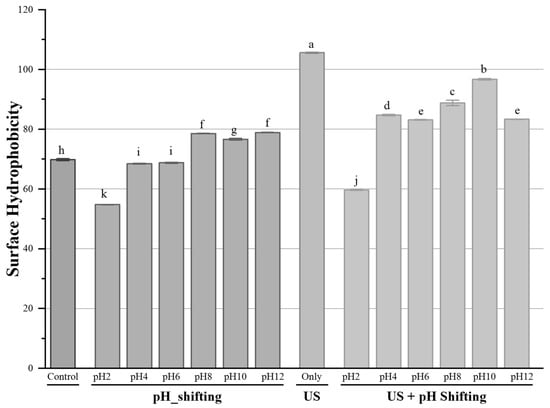 The increase in surface hydrophobicity might be because of the unfolding of protein structure after the pH shifting treatments. The ultrasonication application could further unfold the HPC, causing more exposure and relocation of hydrophobic groups at the surface of proteins [,,]. The increase on surface hydrophobicity can facilitate a better formation of protein gel with more dense and compact properties in order to reinforce hydrophobic interactions [].
