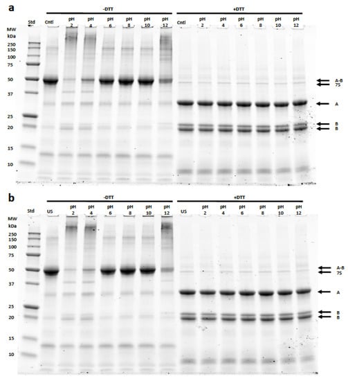 SDS-PAGE was used to analyze the HPC samples undergoing pH shifting, ultrasonication, and the combination of pH shifting and ultrasonication under non-reducing and reducing conditions (Figure 3). The identification of bands corresponding to the two major fractions found in hemp seed protein, albumins (~30%), and globulins (~60%), was based on previous studies [,]. The most prevalent protein found in the HPC is the globulin edestin which consists of six subunits with each subunit consisting of an acidic (Edestin A) and basic (Edestin B) component linked together by disulfide bonding. Specifically, bands below 18 kDa were attributed to albumins and bands of ~48 (Edestin A/B), ~46 (7S globulin), ~34 (Edestin A), ~20 (Edestin B), and ~18 (Edestin B) kDa, which were attributed to globulins. In all conditions, the albumins were preferentially solubilized over the globulins. pH shifting, especially at alkaline conditions, led to the aggregation of proteins shown by the increased staining intensity at higher molecular weights. The aggregation can be attributed to edestin due to the loss of staining intensity at 48 kDa under non-reducing conditions.
