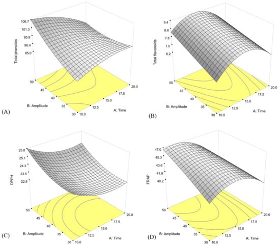 Response surfaces of (A) total phenolic compounds, (B) total flavonoids, (C) DPPH, and (D) FRAP as a function of UAE time and amplitude.
