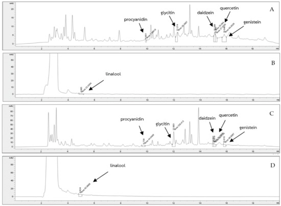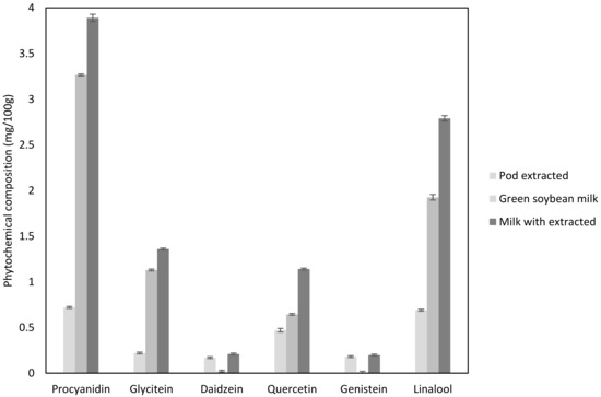 Quantification of phytochemical contents (procyanidins, quercetin, glycitein, daidzein, genistin, and linalool) in crude GSP extracts and green soybean milk with and without the addition of crude GSP extracts were determined using HPLC (Figure 2A–D). The most abundant phytochemicals in crude GSP extracts were procyanidins (0.72 ± 0.01 mg/100 g), followed by linalool (0.69 ± 0.11 mg/100 g) and quercetin (0.47 ± 0.02 mg/100 g). The procyanidin content in the crude GSP extracts in the present study was higher than lentils (0.5 mg/100 g) [42]. Compared to GSP, greater amounts of phytochemicals were observed in green soybean milk with crude extracts, especially procyanidins (3.89 ± 0.04 mg/100 g), linalool (2.79 ± 0.01 mg/100 g), glycitein (1.36 ± 0.01 mg/100 g), and quercetin (1.14 ± 0.01 mg/100 g) (Figure 3).