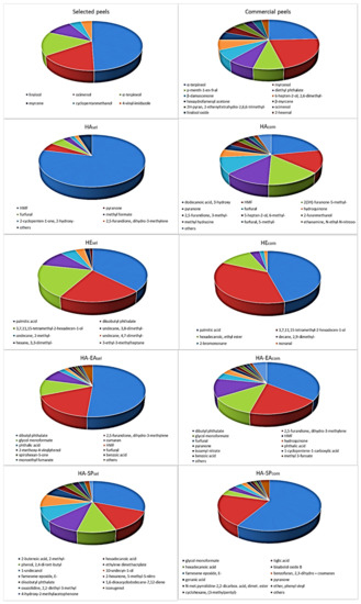 The chromatographic analyses of the peels and of all of the obtained extracts were carried out on Clarus 500 model Perkin Elmer (Waltham, MA, USA) gas chromatograph coupled with a mass spectrometer equipped with a flame ionization detector (FID) and a Varian Factor Four VF-1 capillary column. The operative conditions were the following: oven temperature at 40 °C for 2 min, then increased to 220 °C at 6 °C/min and finally held for 10 min at this same temperature (for the pulps and peels headspace); oven temperature program at 60 °C then increased to 170 °C at 6 °C/min, increased to 250 °C at 8 °C/min and finally held for 10 min at this same temperature (for the liquid phase of the extracts); injector temperatures: at 250 °C for the peels and 270 °C for the direct injection of the extracts liquid phase.