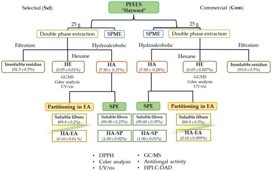 For the extraction of the bioactive compounds from kiwi peels, a double phase extraction was performed according to our previous work [20]. About 25 g of kiwi peels were extracted with a 50 mL of n-hexane and 50 mL of a hydroalcoholic mixture (ethanol:water acidified with 5% of acetic acid, 70:30 v/v) for 3 h at room temperature under stirring. The two phases were separated and concentrated under reduced pressure at 40 °C with a rotary evaporator, weighed and stored at 4 °C until analyzed. The resulting extracts are identified as HAcom and HAsel for hydroalcoholic fraction and HEcom and HEsel for hexane fraction obtained from commercial sample or local cultivation, respectively.