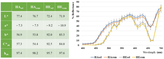 Colorimetric data and reflectance curves of the hydroalcoholic (HA) and organic (HE) extracts. The RSD values, evaluated on triplicates, were <5%.