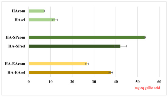 As shown in Figure 5 and Table 2, the catechin amount varied between 3 and 24 mg/g of the extract (minimum value detected in HAcom and maximum in HA-SPsel). Epicatechin, between 3 and 9 mg/g, was only recorded in SPE purified extracts and was more represented in the commercial sample. Caffeic acid varied between 0.5 and 9 mg/g, and along with sinapic acid (1.6–1.7 mg/g) was found only in SPE extracts.