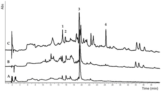 Example chromatograms at 280 nm of: A, hydroalcoholic extracts; B, HA-SP extracts; C, HA-EA extracts. Quantified peaks: 1, catechin; 2, epicatechin; 3, caffeic acid; 4, sinapic acid.