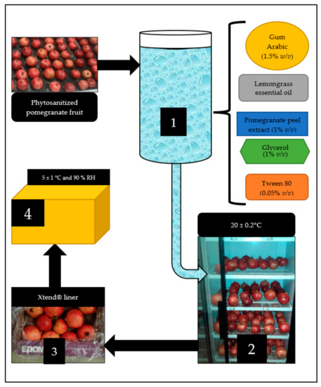 Flow diagram of the process of coating (1), drying (2), packaging (3) and cold storage (4) of phytosanitized ‘Wonderful’ pomegranate fruit.