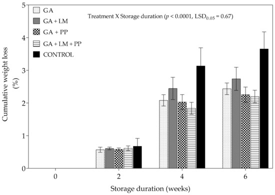 Cumulative weight loss (%) of ‘Wonderful’ pomegranate whole fruit coated with gum arabic (GA) coatings enriched with lemongrass oil (LM) (0.1% v/v) and/or pomegranate peel extract (PP) (1% w/v) and stored at 5 ± 1 °C (95 ± 2% RH) for 6 weeks followed by 5 d at shelf-life conditions (20 ± 1 °C and 60% RH). Vertical bars represent the standard error (SE) of mean values of 10 measurements (10 fruit per treatment). LSD0.05 represents least significant difference (p < 0.05).