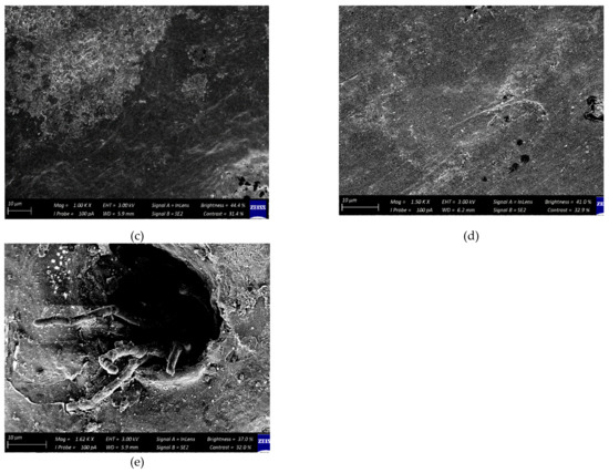Scanning electron micrographs of ‘Wonderful’ pomegranate peel after 6 weeks of cold storage at 5 °C. (a)—gum arabic (GA); (b)—gum arabic + lemongrass oil (GA + LM); (c)—gum arabic + pomegranate peel extract (GA + PP); (d)—gum arabic + lemongrass oil + pomegranate peel extract (GA + LM + PP); (e)—Uncoated control.