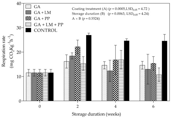 Respiration rate (mg CO2Kg−1h−1) of ‘Wonderful’ pomegranate fruit coated with gum arabic (GA) coatings enriched with lemongrass oil (LM) (0.1% v/v) and/or pomegranate peel extract (PP) (1% w/v) and stored at 5 ± 1 °C (95 ± 2% RH) for 6 weeks followed by 5 d at shelf-life conditions (20 ± 1 °C and 60% RH). Vertical bars represent the standard error (SE) of mean value of three replicates (3 fruit per replicate). LSD0.05 represents least significant difference (p < 0.05).