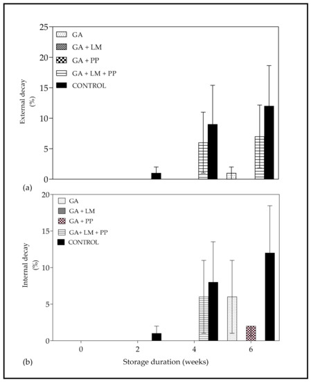 External decay was first observed after 2 weeks of cold storage with uncoated fruit showing 1% decay incidence (Figure 5a). Decay incidence increased as storage duration was extended and after 6 weeks, uncoated fruit recorded 12% decay incidence. Moreover, fruit coated with GA + LM and GA + PP recorded 0% decay incidence after 6 weeks of cold storage. Similar to external decay, internal decay was first observed after 2 weeks with uncoated control fruit recording 1% decay incidence (Figure 5b). Internal decay increased with storage duration and after 6 weeks, uncoated control fruit recorded 12% decay incidence. No internal decay was observed for fruit coated with GA, GA + LM and GA + PP throughout the 6 weeks of cold storage.