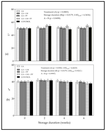 Figure 6 shows the changes in color attributes (L*, a*, C* and h°) of uncoated and coated ‘Wonderful’ pomegranates as a function of storage time. Despite slight changes in lightness (L*) with the passage of storage time, statistical analysis showed no significant change in L* (Figure 6a) and redness (a*) (Figure 6b). Slight differences in color saturation (C*) between coated and uncoated fruit were only observed after the 4-week storage period (Figure 7a), where coated fruit (GA + LM = 51.03 ± 0.93) had higher color saturation compared to untreated control (46.74 ± 1.22); also, higher a* values were observed compared to untreated control. Upon application of coating treatments on day 0, GA + LM coated fruit recorded higher h° values compared to the other treatments. Despite some fluctuations, there were no significant changes in h° with the extension of storage duration for most of the coating treatments (Figure 7b).