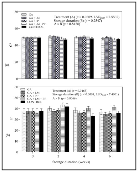 Color attributes, (a) Chroma (C*) and (b) hue angle (h°) of ‘Wonderful’ pomegranate whole fruit coated with gum arabic (GA) coatings enriched with lemongrass oil (LM) (0.1% v/v) and/or pomegranate peel extract (PP) (0.1% w/v) and stored at 5 ± 1 °C (95 ± 2 % RH) for 6 weeks followed by 5 d at shelf-life conditions (20 ± 1 °C and 60%RH). Vertical bars represent the standard error (SE) of mean value calculated from 10 measurements per treatment (1 fruit = 1 measurement). LSD0.05 represents least significant difference (p < 0.05).