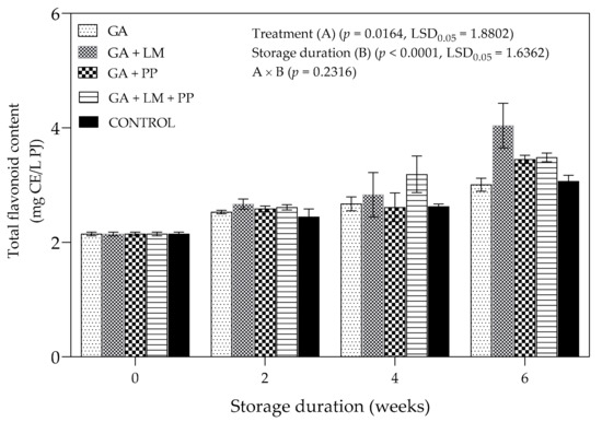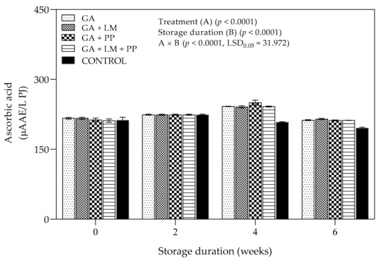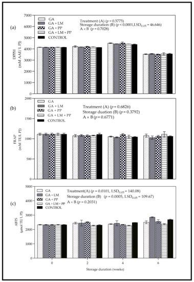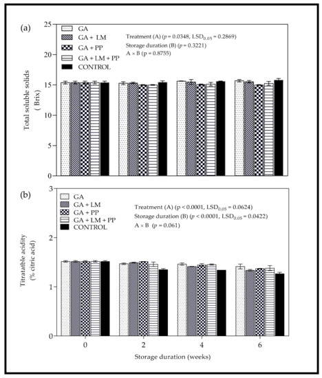 Studies have shown that the application of edible coatings on pomegranate fruit stored under low temperature conditions suppressed decay weight loss and maintained overall quality [58,59]. Similarly, Kawhena et al. [60,61] demonstrated the efficacy gum arabic, sodium alginate and starch-based coatings to minimize weight loss and decay severity in ‘Wonderful’ pomegranates during cold storage and shelf life. However, to the best of our knowledge, few reports exist which show the effect of coatings enriched with active components such PP and/or LM on postharvest quality of any pomegranate fruit during storage and shelf life. Combining PP and LM as active components of coatings may potentially produce a synergistic effect against microbial proliferation and extend the storage and shelf life of pomegranate fruit. Furthermore, considering the economic importance and health benefits of pomegranate fruit, the present study had the specific objective to formulate coatings from PP and LM and investigate the efficacy to retard loss of physicochemical properties and phytochemical status and antioxidant capacity of ‘Wonderful’ pomegranate during cold storage.