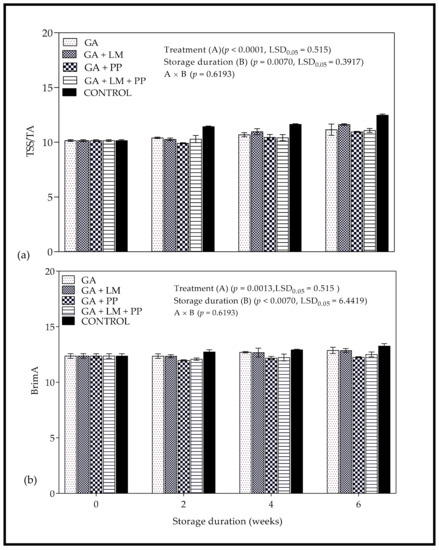 As shown in Figure 9a, TSS/TA increases as storage duration was extended, with coating treatments recording lower values than control. Statistical analysis also showed that the main differences in BrimA index were due to interactions (p < 0.0107) between coating treatments and storage duration. The changes in Brim A values as shown in Figure 9b reflected the levels of TSS and TA in fruit during storage.
