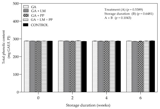Figure 10 shows the concentration of total phenolic content (TPC) during cold storage of ‘Wonderful’ pomegranates. As storage was extended, there were no significant changes in TPC across all coating treatments. After the 6-week storage period, GA + LM and uncoated fruit recorded the lowest (286.583 mg GAE/L PJ) and highest (289.24 mg GAE/L PJ) TPC, respectively.