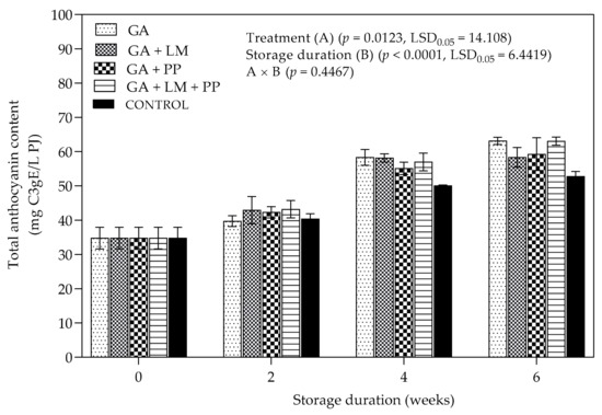 The change in total anthocyanin content (TAC) was evaluated for all treatments over 6 weeks of cold storage and 5 d under shelf-life conditions (Figure 11). There was an increase in TAC for coated and uncoated fruit from day 0 to 6 weeks. However, the rate of increase was higher in coating treatments (GA, GA + LM and GA + PP) than uncoated fruit. At the end of the storage period, the highest (63.14 mg C3G/L PJ) and lowest (52.77 mg C3G/L PJ) TAC values were recorded for GA and uncoated fruit. Overall, coating treatments (GA, GA + LM and GA + PP) recorded significantly higher TAC than uncoated fruit between 4 and 6 weeks of storage.