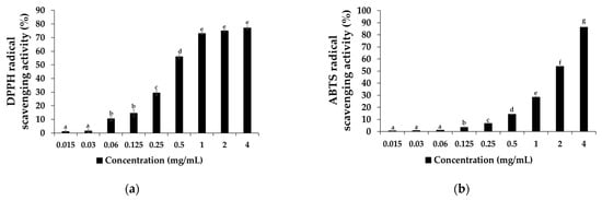 To evaluate antioxidant activity by DPPH and ABTS radicals’ scavenging ability, liquid extractions of SAL samples were diluted in concentrations of 0.015, 0.03, 0.06, 0.125, 0.5, 1, 2, and 4; then, 0.2 mM DPPH (2,2-diphenyl-1-picrylhydrazyl) was added 1:1, followed by the reaction at room temperature for 30 min. The absorbance was measured at 517 nm [18]. For the ABTS radical, 7.4 mM ABTS was prepared using a PBS buffer, 2.6 mM The potassium persulfate was prepared and mixed 1:1, and then kept in a dark place at room temperature for one day. When the mixed ABTS and PBS were combined in a ratio of 1:15 and measured by absorbance at 734 nm, they became 0.7. The SAL sample was diluted by concentration, the reagent and the sample were mixed in a ratio of 950:50, and then reacted in a dark room for 30 min at room temperature. The absorbance was then measured at 734 nm [18]. The radicals’ scavenging ability (%) was calculated using the following Equation (1).