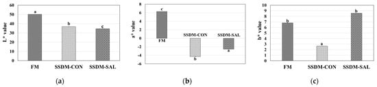 FM and SSDM groups color parameters of the L*, a*, and b* value changes are shown in (a–c), respectively. Comparisons were made between the fresh and experimental groups (n = 5 per group). The letters a, b and c in each bar graph represents significant difference at p < 0.05. L*, lightness; a*, redness; and b*, yellow.