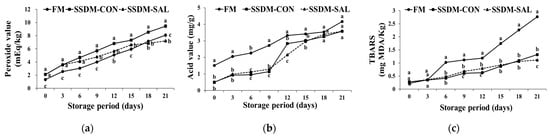 Changes in peroxide (PV) (a), acid (AV) (b), and TBARS value (c) in the FM and SSDM groups during refrigerated storage at 4 °C for 21 days. Values represent mean ± standard deviation (SD) (n = 5). Different superscript letters indicate significant differences (p < 0.05).