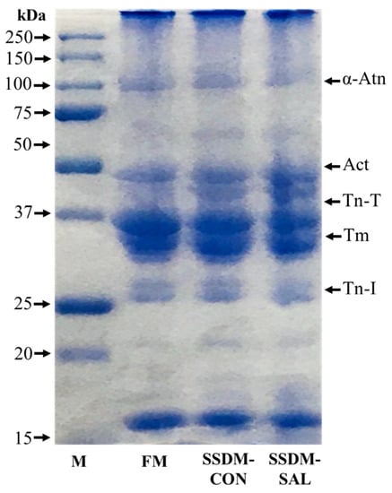 Protein levels of around 60–70% are present in the muscle fibers of fish meat [12]. The protein patterns in the FM and SSDM experiments were analyzed using SDS-PAGE electrophoresis. Major protein bands of α-actinin (α-Atn), actin (Act), troponin T type 3b protein fragment (Tn-T), tropomyosin (Tm), and troponin I protein (Tn-I) were observed in the FM and SSDM groups, as shown in Figure 4. These results indicate that there were no remarkable changes in the protein profiles between the FM, SSDM-CON, and SSDM-SAL groups. However, intensities of actin and Tn-T bands were higher in the SSDM-SAL group than in the SSDM-CON and FM groups. This might be because the proteins in the SSDM-SAL group were less influenced by denaturation during the salted and semi-dried process.