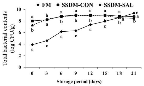 As shown in Figure 5, during refrigerated storage (4 °C) for 21 days, the total microbial counts gradually increased from 3.92 to 9.34 log CFU/g in the FM group. The SSDM groups had higher initial microbial levels than the FM group. The total microbial counts increased from 8.01 to 8.76 log CFU/g in the SSDM-CON group and 7.28 to 8.46 log CFU/g in the SSDM-SAL group. The decrease in the total bacterial counts was expected due to the semi-dried salting process in the SSDM groups. The total bacterial contents were significantly increased in both the FM and the SSDM groups. This might be because bacteria adapted to the fish skin environment, the major source of the development of microbial organisms during storage [35]. Other studies have suggested that processed fish products might be contaminated by microorganisms during fish processing and storage [61]. However, during storage, the total bacterial count rapidly increased in the FM group; moreover, the count was significantly higher after 18 days storage time when compared to the SSDM-CON and SSDM-SAL groups. In addition, in the SSDM-CON group, the microbial count was significantly higher than in the SSDM-SAL group. This indicates that the SAL treatment improved microbial safety during the refrigerated storage time. This demonstrates that bioactive compounds were present in the SAL, which showed antioxidant and antimicrobial effects. The two-way statistical ANOVA results strongly suggested that there was a statistically significant effect of the interaction between the mullet groups and the storage time on the total bacterial content (F = 937.149, p < 0.05), which varied between the FM, SSDM-CON and SSDM-SAL groups during storage. These results suggested that the SAL treatment prevented bacterial growth in the SSDM-SAL group compared with the FM and SSDM-CON groups.