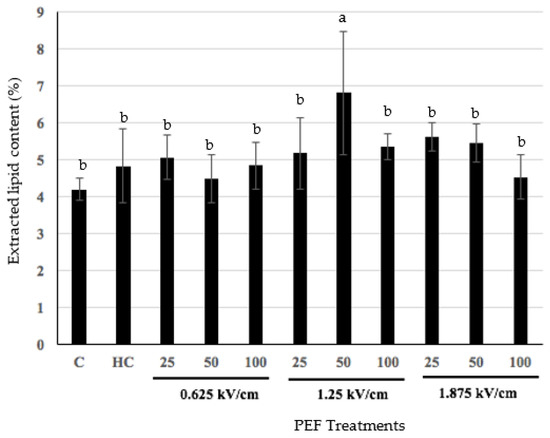 Figure 1 shows the effect of PEF pre-treatment on the total lipid yield extracted from the HMG samples. Overall, there was an increase in lipid yield following PEF treatment, but the only significant increase (p < 0.05) was achieved with PEF pre-treatment at a field strength of 1.25 kV/cm and frequency of 50 Hz (Figure 1). This indicates that the application of these PEF conditions was sufficient to cause structural modification in the male gonad tissue, which enhanced the subsequent extraction of lipid, in that PEF mediated electroporation resulted in enhanced permeabilization of cell membranes, allowing for greater movement of solvent into the sample during lipid extraction [30]. However, the use of PEF as a pre-treatment did not result in a significant (p > 0.05) difference in total lipid yield, compared to that obtained from un-treated HMG. Previous studies on the application of PEF in the fish processing industry have reported positive results for the technology. For example, Zhou et al. (2017) found that PEF can enhance extraction and protein yield from mussels [19]. Li et al. (2016) found an enhanced extraction yield of abalone viscera protein from Haliotis discus hannai ino viscera through the application of PEF [31]. Similarly, He et al. (2017) demonstrated the ability of PEF to enhance the extraction and yield of chondroitin sulfate, calcium, and collagen from fish bone [18]. It is not understood as to why relatively mild PEF conditions led to an enhanced lipid yield from HMG, in the present study (Figure 1), however, the milder PEF conditions would result in less heating of the male gonad material, which may have an effect on lipid extraction. Although previous studies found increased extractability of protein, calcium, chondroitin sulfate, and collagen from fish bone of various marine species, which correlated with higher PEF intensity, HMG may respond differently to PEF treatment, and further investigation is required to understand the mechanisms involved [18,19,31].