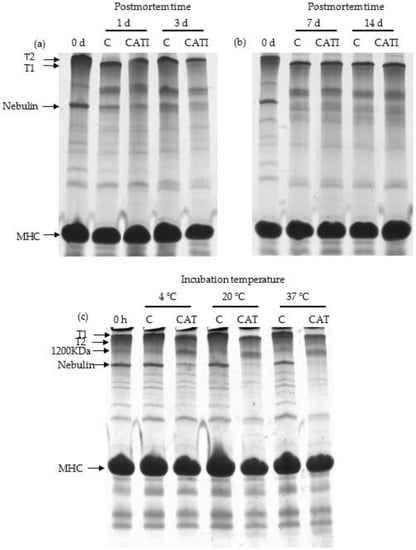 Titin (approximately 3000 kDa) and nebulin (approximately 800 kDa), anchoring one of their ends to the Z-line, are considered to be important contributors to myofibril integrity and meat tenderness [,,]. The effect of CAT on hydrolysis of titin and nebulin in vivo and in vitro is shown in Figure 1. For the 0 day samples, a major band for intact titin (T1) was observed. After 1 day postmortem, a major band for T1 degradation was observed, marked as T2 (approximately 2400 kDa), which was in accordance with the results reported by Taylor et al. []. Nevertheless, there was no observable difference between the various postmortem aging times. Regarding the T2 bands at 1, 3, 7, and 14 day postmortem, no obvious difference (p > 0.05) was found between the control and samples treated with CATI. In contrast to that of titin, the intensity of the nebulin band decreased (p < 0.05) as postmortem aging time increased. In particular, the intact nebulin band had nearly disappeared after 7 day postmortem. However, no obvious changes were found between the control and samples treated with CATI during the postmortem. These results indicated that CAT had no effect on the degradation of titin and nebulin during postmortem aging.