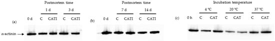 α-Actinin is crucial for connecting together actin filaments from adjacent sarcomeres, and forming the Z-disk, and then contributing to proper muscle physiology []. Changes of α-actinin caused by CAT in vitro and in vivo were investigated (Figure 2). As shown in Figure 2a,b, proteolytic fragments of α-actinin were not detected in all bands when using anti-α-actinin monoclonal antibody in vivo. This was in accordance with the study of Ho et al., who revealed that little α-actinin change was detected using western blot analysis through 28 d of bovine longissimus muscle postmortem aging []. Also, the degradation fraction of α-actinin was not detected in all samples in vitro (Figure 2c). Taken together, CAT had no effect on the degradation of α-actinin both in vivo and in vitro.