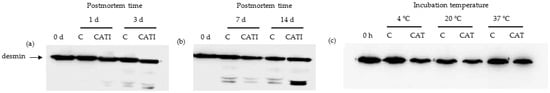 The effect of CAT on the degradation of desmin in vitro is shown in Figure 3c. Compared with the 0 day sample, the degradation fragment of desmin was not detected in the control sample at 4, 20, and 37 °C, indicating that temperature did not affect the degradation of desmin. In addition, compared with the control sample, the degradation fragment of desmin was also not detected in the CAT-treated samples, regardless of incubation temperature. These results indicated that CAT did not participate in the degradation of desmin in vitro.