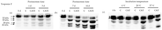 Troponin-T is the tropomyosin-binding component of the troponin complex, and is generally considered to be the most proteolytically sensitive subunit of the troponin molecule []. Degradation of troponin-T is considered to be an indicator of meat aging and tenderization [,], as denoted by the appearance of the main proteolysis fragments of 28–32 kDa [,,,]. Representative western blotting patterns are shown in Figure 4a,b, and the lanes indicate that the anti-troponin-T monoclonal antibody could clearly and strongly recognize the troponin-T bands. At 0 day postmortem, the 28, 30, and 32 kDa bands were detected, which might be mainly due to the part degradation of troponin-T in the extracting process of samples. Compared with the 0 day sample, a new 26 kDa band was detected during postmortem aging from 1 day to 14 day. In addition, the intensity of 26–32 kDa bands was gradually increased (p < 0.05) with increased postmortem time for both control and CATI-treated samples, accompanied by a decrease in the intensity of troponin-T band. In addition, there was no obvious change (p > 0.05) between the control and CATI-treated samples at 1 day and 3 day postmortem. Nevertheless, compared with the control, the degradation of troponin-T treated with CATI was more obvious after 7 day postmortem, and the intensity of 26–32 kDa bands was higher than that of the control samples. These results indicated that CAT participated in the degradation of troponin-T during postmortem aging.