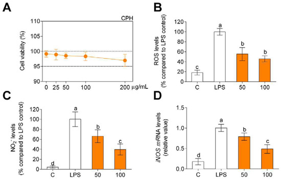 Cell viability (A), production of ROS (B), and nitriles (C) expressed as fluorescence/absorbance and iNOS mRNA levels (D) compared to LPS-stimulated cells after CPH treatment at 50 and 100 μg/mL for 24 h in human primary monocytes. The values are presented as means ± SD (n = 3). Different letters denote statistical differences (p < 0.05).