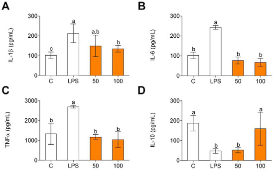 Pro-inflammatory (A–C) and anti-inflammatory (D) cytokine production in human primary LPS-stimulated monocytes after CPH treatment at 50 and 100 μg/mL for 24 h. The values are presented as means ± SD (n = 3). Different letters denote statistical differences (p < 0.05).